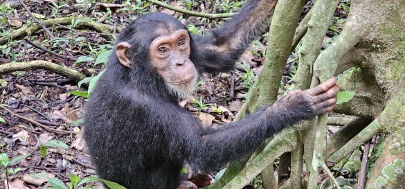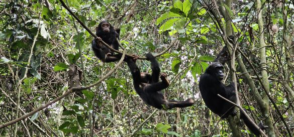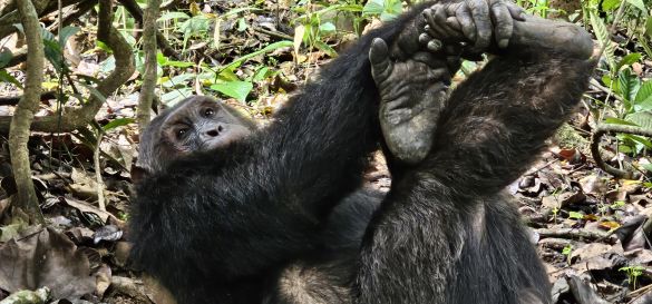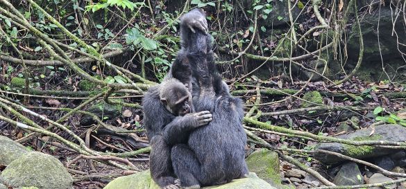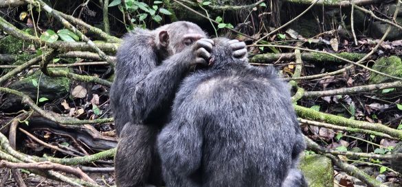 The calls of the chimpanzees accompany us on our journey, and on the banks of the river we watch as they remain in a relaxed position. An extraordinary behavior awaits us: the "high-five" or „grooming handclasp“ of Mahale's chimpanzees, in which grooming partners hold hands and stretch vertically upwards while their free hands groom each other's fur . This unique gesture has so far only been observed in the chimpanzees of this area and it fascinates us deeply.